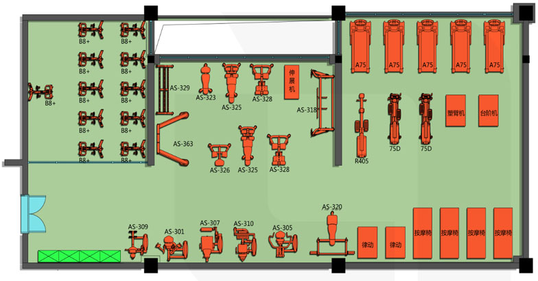 此方案主要由有氧器材和力量器材及單車房組成,適用于小型專業(yè)健身房、專業(yè)健身私教工作室或企事業(yè)單位健身房。